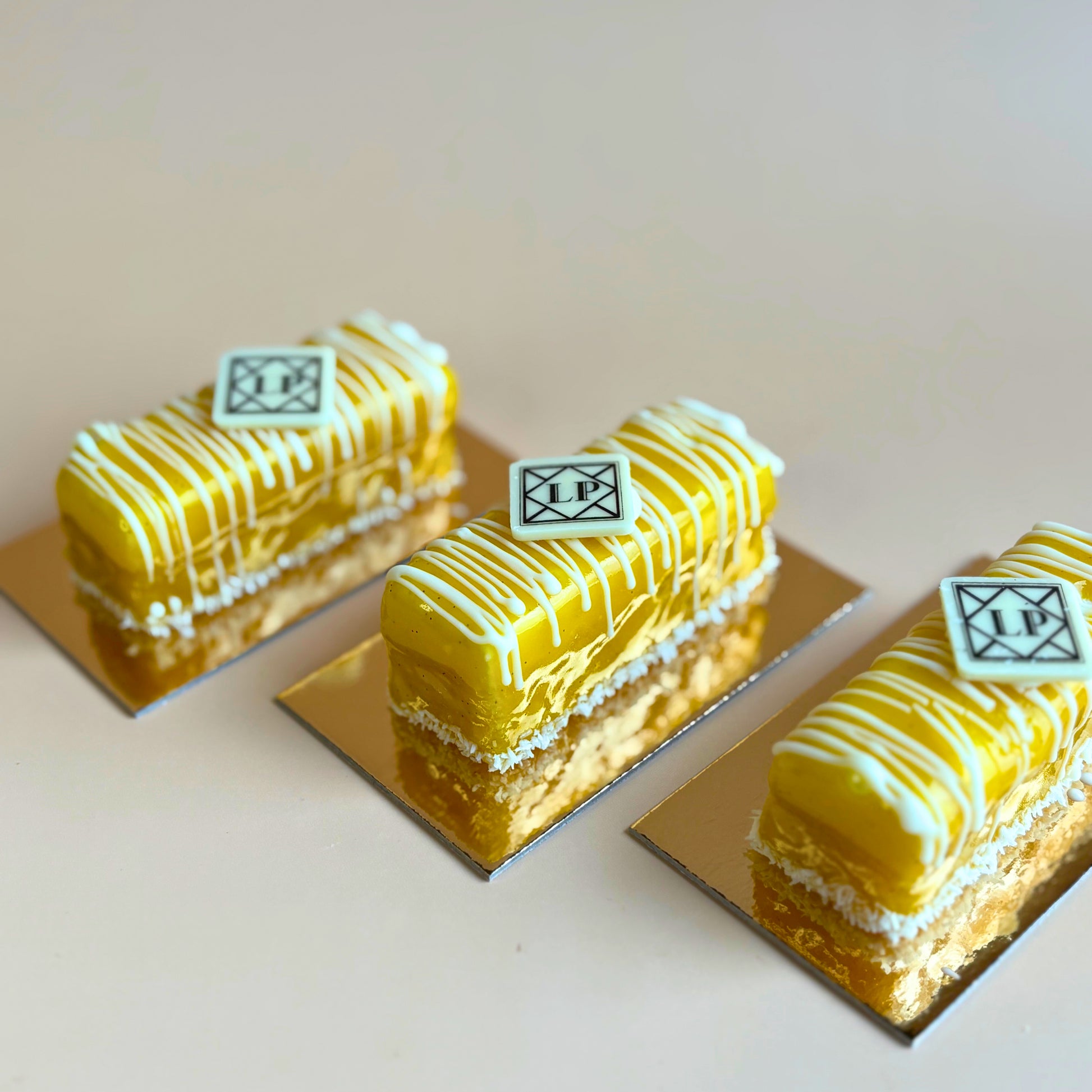 Coconut mousse with a soft coconut sponge, and pineapple glaze. Finished with shredded coconut and white chocolate.
